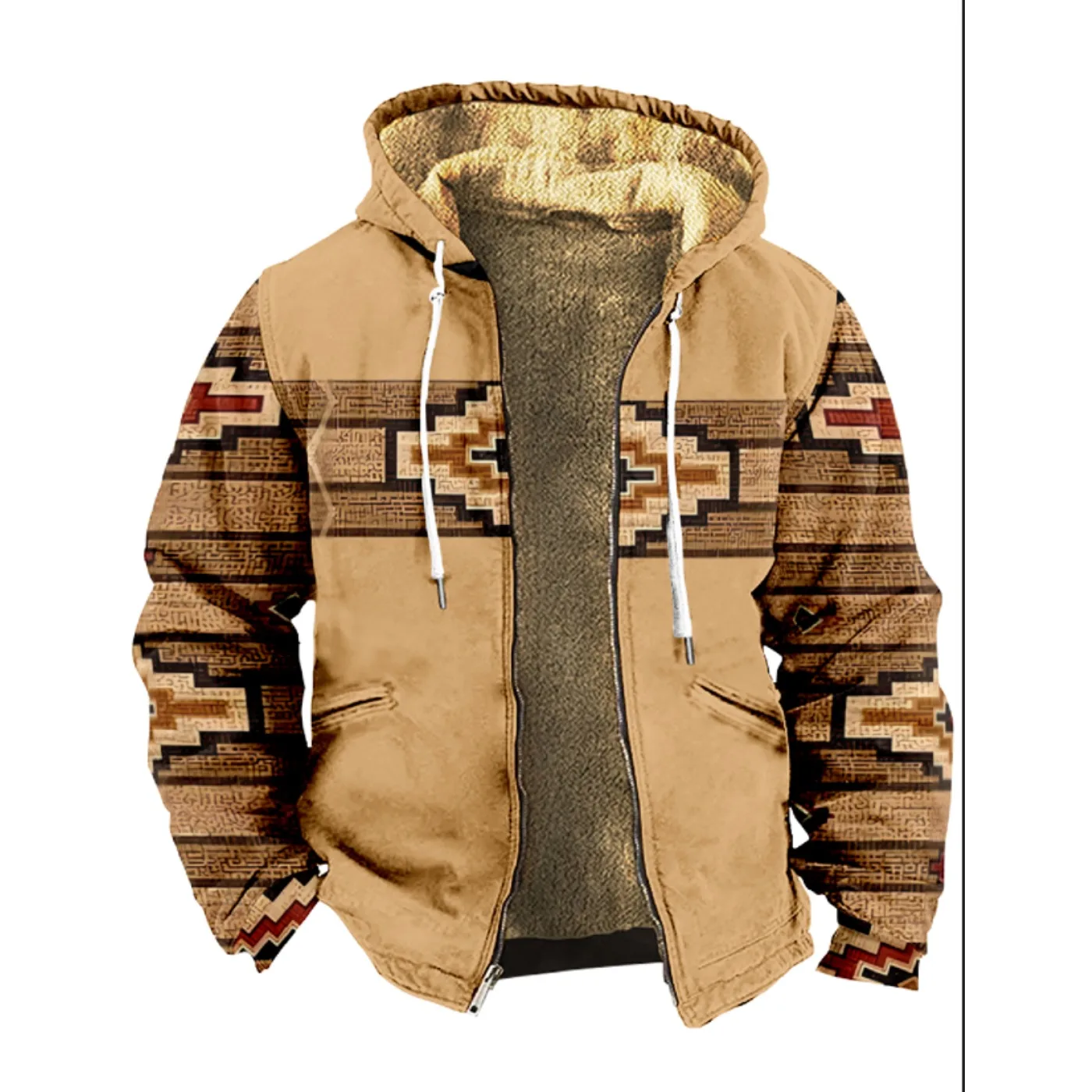 Men's and women's thick wool hooded double-layer jackets, retro printed street zippers for winter and autumn, keep warm outdoors